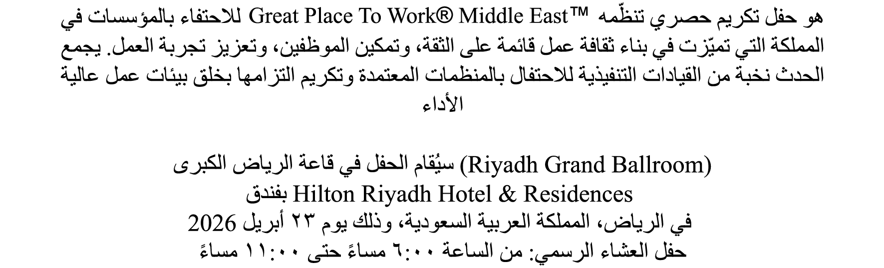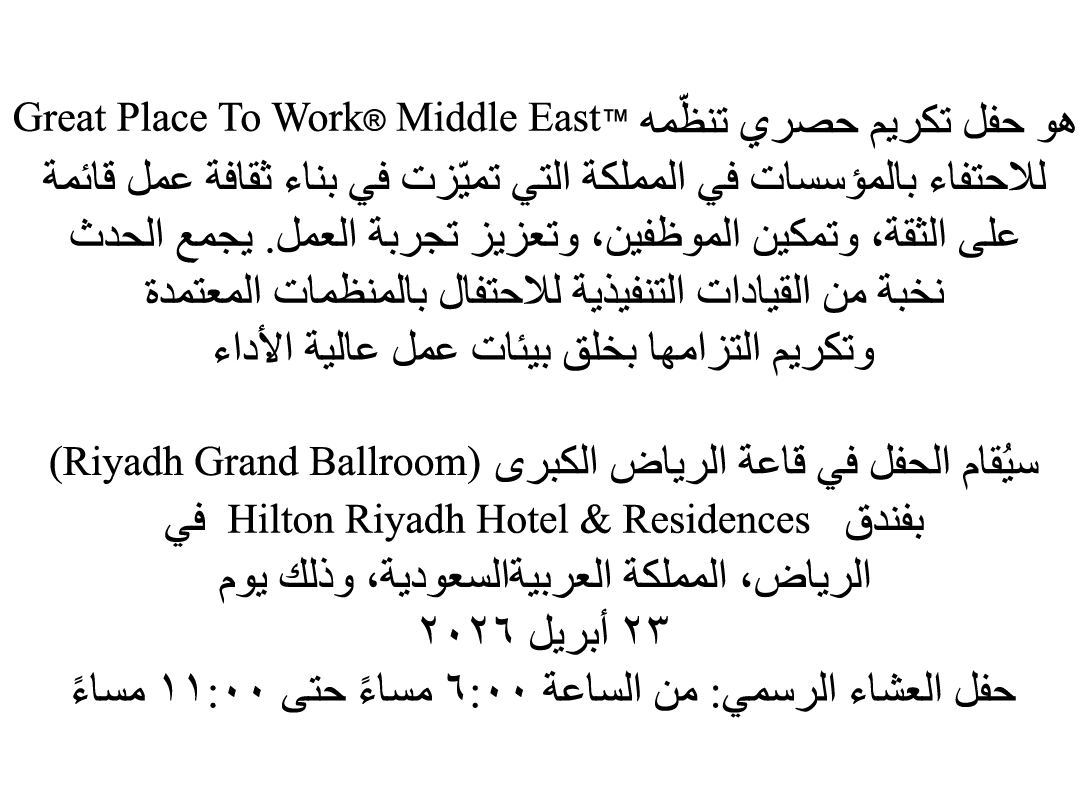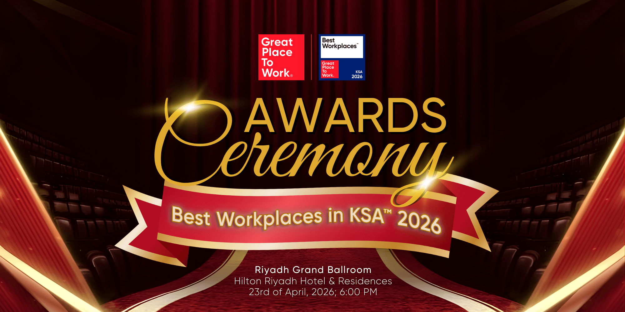 هو حفل تكريم حصري تنظّمه ™️Great Place To Work®️ Middle East للاحتفاء بالمؤسسات في المملكة التي تميّزت في بناء ثقافة عمل قائمة على الثقة وتعزيز تجربة الموظفين. يجمع الحدث نخبة من القيادات التنفيذية للاحتفال بالمنظمات المعتمدة وتكريم التزامها بخلق بيئات